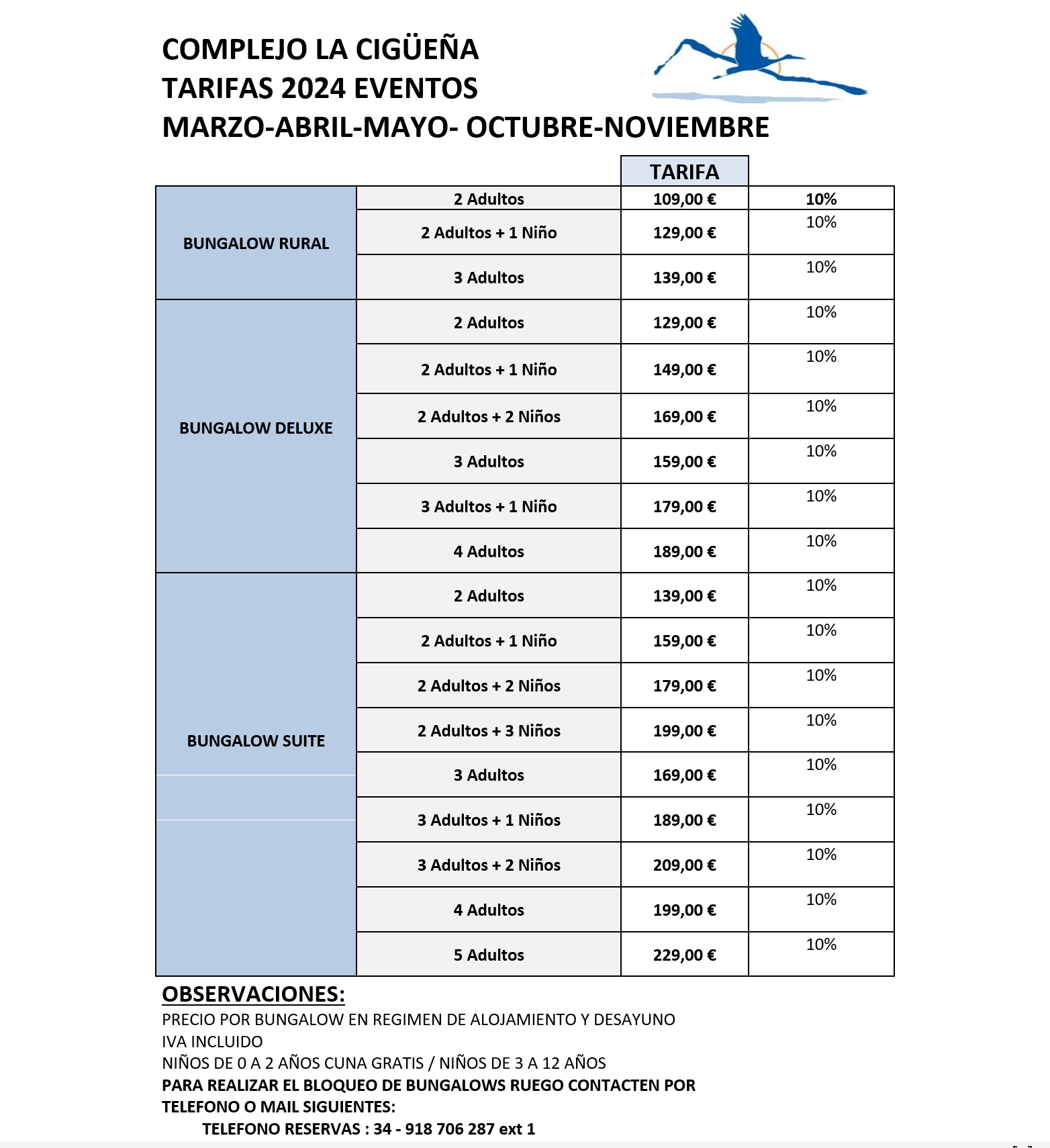 En Complejo la Cigüeña tienes a tu disposición la posibilidad de alojarte en uno de sus bungalows. Te dejamos la información sobre los precios, el descuento aplicable por ser de nuestra boda y el teléfono de contacto